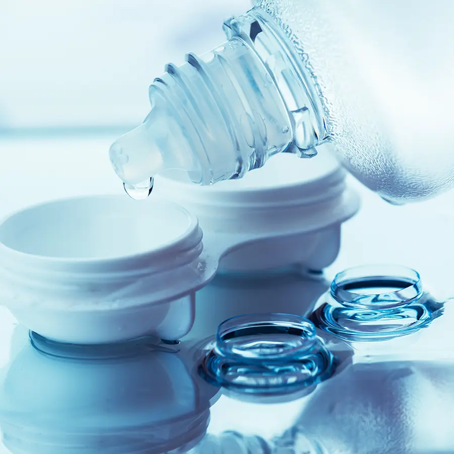 Dr. Uong says that contact lenses should be cleaned with the recommended contact solution to reduce your risk of an eye infection. Contact lens solutions are chemically formulated to properly disinfect your lenses to keep them safe and comfortable to wear.